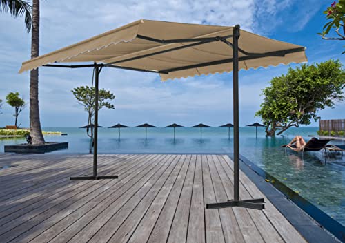 Mobile Standmarkise in Farbe sand mit stabilen Gelenkarmen.