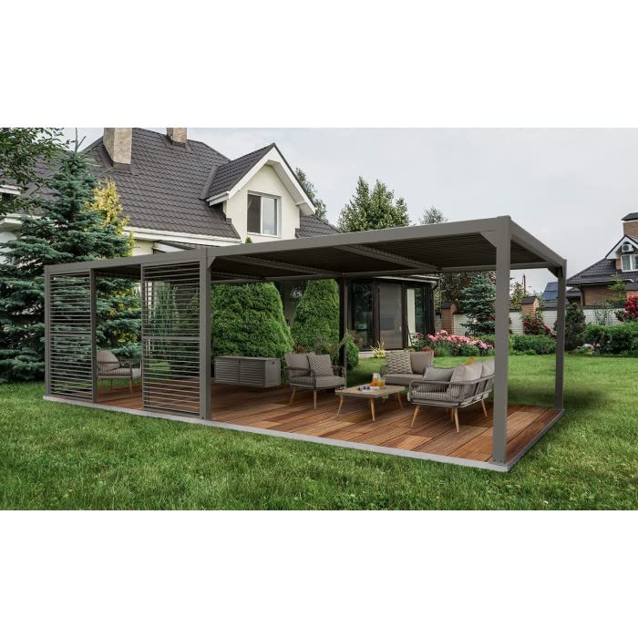 RAHMEN UND GESTELL bestehen aus pulverbeschichtetem Aluminium – robust, stabil und wetterfest. Maße: 7,8×4×2,3 m (L×B×H). Dachstreben: 145×23 mm, 1,4 mm stark; Beine: 100×100 mm, 1,6 mm stark; obere Balken: 120×45 mm, 2,0 mm stark. Unsere Pergola ist in den Größen 3×3, 3×4, 4×4, 5,8×3, 5,8×4 und 7,8×4 m sowie in Weiß, Grau und Holzoptik erhältlich. Vielseitig einsetzbar als Gartenhaus, Zelt -Alternative, Markise, Carport oder Sonnenschutz Balkon – die perfekte Lösung für Garten und Terrasse.
