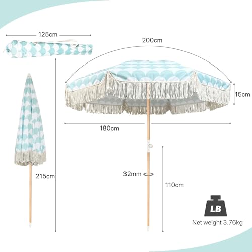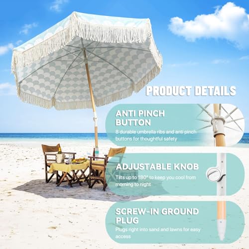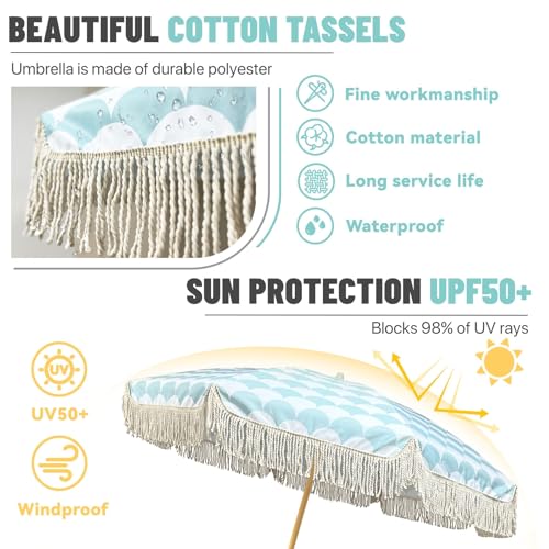 【Robust und langlebig】: Der Boho-Regenschirm besteht nicht mehr da 8 robusten Fiberglas-Regenschirmknochen und 32mm Massivholzstange, die bombastisch, haltbar und windbeständig ist. Mit einem Anti-Pinch-Schalter, um Handverletzungen beim Öffnen und Ableiten zu vorbeugen, was Ihnen mehr Seelenfrieden gibt. Der Schirmstock kann mit einer Tragetasche abstandslos zusammengeklappt werden und ist somit leicht zu transportieren und zu verstauen. Ideal für Reisen, Camping und Strandurlaube.