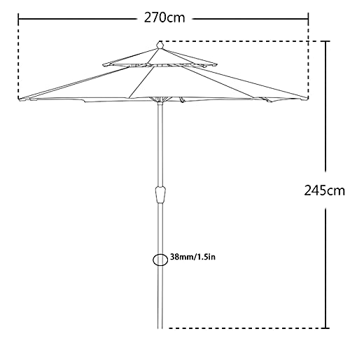 Tipp: Da die doppellagige Oberseite des Schirms ausgehöhlt ist, dient sie hauptsächlich als Sonnenschutz und Windschutz. Wenn Sie höhere Anforderungen an den Regenschutz haben, überlegen Sie es sich bitte sorgfältig. Der Sonnenschirmständer ist nicht im Sonnenschirm enthalten.