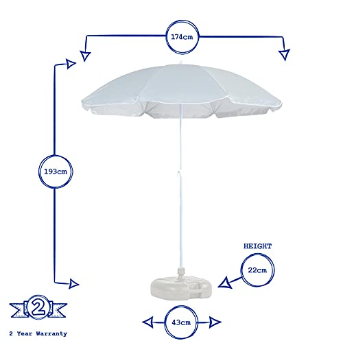 Abmessungen: Sonnenschirm (schneefrei) d: 1.74m H: 1.93m Pole D: 19mm Base C: 20 Liter W: 42 cm d: 43 cm H: 22 cm