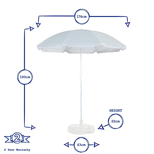 Abmessungen: Sonnenschirm (abgetaut) d: 1.74m H: 1.93m Pole D: 19mm Base C: 20 Liter W: 42 cm d: 43 cm H: 22 cm