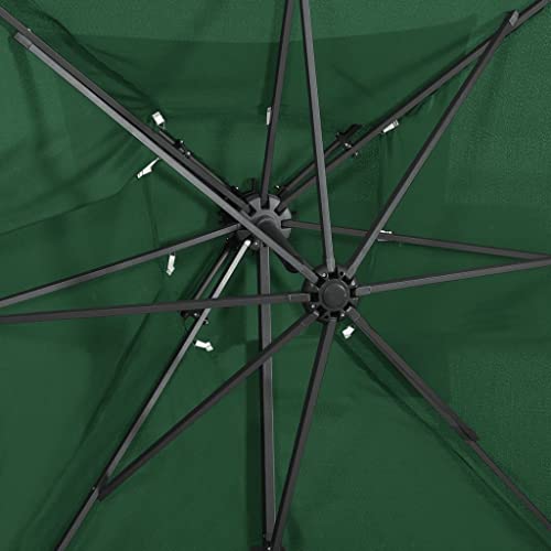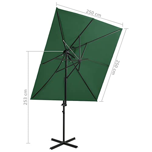 Home Products Freischwingerschirm mit doppeltem Oberteil, grün, 250 x 250 cm. Dieser freitragende Regenschirm ist perfekt, um Schatten zu arbeiten und Sie vor den schädlichen UV-Strahlen der Sonne zu schützen. Jeder UV-Abschirmung- und lichtechtem Polyester gefertigt, bietet Ihnen die Sonnenschirmhülle optimalen Abschirmung vor der Sonne und ist leicht zu reinigen. Es verfügt über einen stabilen Kreuzsockel für mehr Stabilität. Das exklusive Design dieses Sonnenschirms ermöglicht es Ihnen, ihn um 360 Maß zu neigen und zu drehen, um die Sonne zu blockieren. Die starke Aluminiumstange und die 8 Rippen machen den Sonnenschirm stark sicher und langlebig. Dieser Gartenschirm lässt sich durch den Kurbelmechanismus einfach öffnen und derivieren. Darüber hinaus hilft das Durchschrift-Top-Design Baldachin bei der Belüftung. Bitte berücksichtigen Sie, dass wir empfehlen, den Schirmstoff mit einem Imprägnierspray zu abfassen, wenn er starken Niederschlägen ausgesetzt ist.