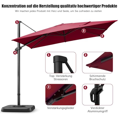 ✅【Einige Tipps】Bitte berücksichtigen Sie, dass unsere Schirme mit einem Kreuzfuß geliefert werden, während Gegengewichtsfüße nicht enthalten sind. Um die Stabilität zu gewährleisten, sollten Sie vier Pflastersteine um den Kreuzsockel umher platzieren oder unsere kompatiblen Sockeloptionen ausprobieren. Wertschätzen Sie bei der Abstimmung des Sockels auf Kompatibilität, um optimalen Halt zu gewährleisten. Um die Langlebigkeit Ihres Schirms zu erhalten, empfehlen wir, ihn bei starkem Wind oder starkem Regen zu generalisieren, um mögliche Schäden zu verhindern.