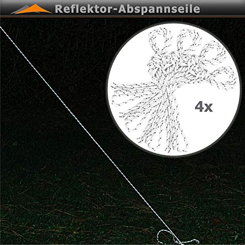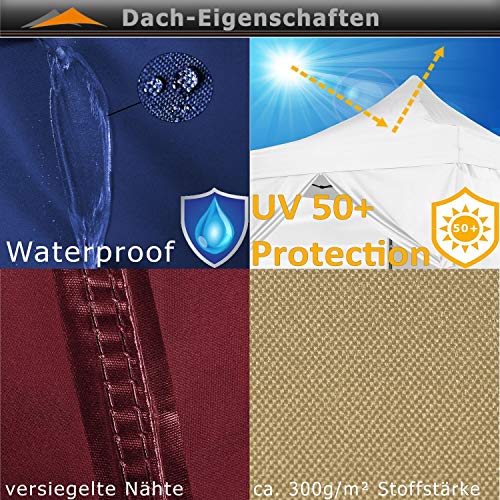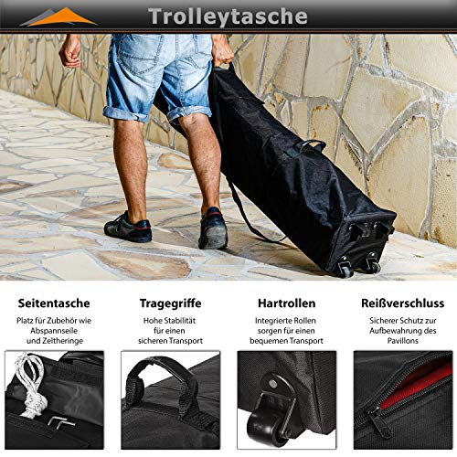 Maße (BxHxT): 300 x 310 – 340 x 300 cm, Material Gestell: Leichtmetall, Material: Suchtgift: 300 g/m² 300D Polyester , Lieferumfang: Unterricht, Heringe, Abspannseile, Trolley-Tragetasche