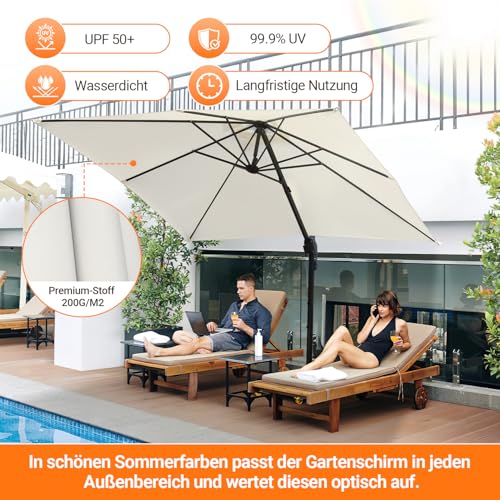 PURPLE LEAF Sonnenschirm Balkon 300 x 300 cm Ampelschirm Drehbar Marktschirm Groß 360°Rotation, Gartenschirm mit Kurbel, XXL Sonnenschutz UV50+, Beige