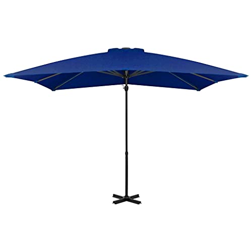 Freischwingender Regenschirm mit Aluminiumstange Azurblau 250 x 250 cm. Dieser elegante Hängesonnenschirm ist perfekt, um Schatten zu schinden und Sie vor den schädlichen UV-Strahlen der Sonne zu schützen. Allesamt UV-Abschirmung- und lichtechtem Polyester gefertigt, bietet Ihnen die Sonnenschirmhülle optimalen Abschirmung vor der Sonne und ist leicht zu reinigen. Es verfügt über einen stabilen Kreuzsockel für mehr Konstanz. Das exklusive Design dieses Sonnenschirms ermöglicht es Ihnen, ihn um 360 Tönung zu neigen und zu drehen, um die Sonne zu blockieren. Die starke Aluminiumstange und die 8 robusten Rippen machen den Sonnenschirm stark gefestigt und langlebig. Dieser Gartenschirm lässt sich durch den Kurbelmechanismus einfach öffnen und generalisieren. Bitte achten Sie, dass wir empfehlen, den Schirmstoff mit einem Imprägnierspray zu abhandeln, wenn er starken Niederschlägen ausgesetzt ist.