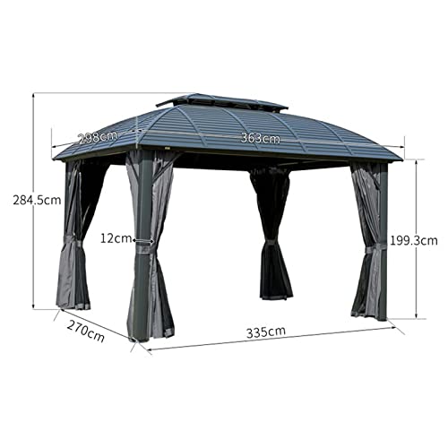 GRÖSSE DES ÜBERDACHUNGS-GAZEBOS IM FREIEN —- Gesamtgröße: 3 m x 3,65 m x 2,85 m, die Installation dauert etwa 2–4 Stunden, 2–5 Personen werden empfohlen. Hinweis 1: Der Schnee auf dem Dach muss entfernt werden; Hinweis 2: Die Verwendung an windigen und regnerischen Tagen wird nicht empfohlen.