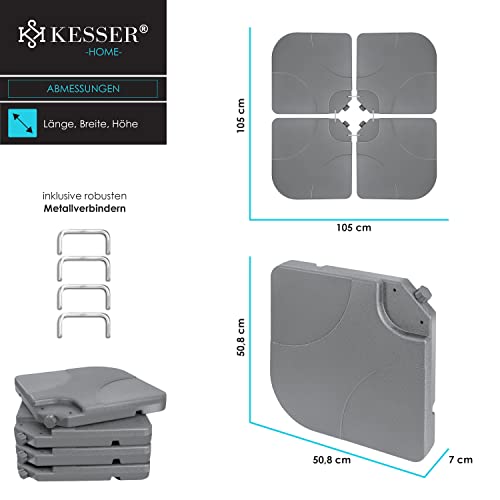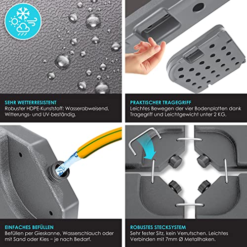 𝐄𝐈𝐍𝐅𝐀𝐂𝐇𝐄 𝐌𝐎𝐍𝐓𝐀𝐆𝐄: Ein Tragegriff ermöglicht Ihnen ein einfaches Bewegen der vier Bodenplatten, einfach an den Wunschort transportieren und je nach Wunsch und Wetterlage mit einem Wasserschlauch oder Gießkanne mit 60 Liter Wasser befüllen. Bei starkem Wind können Sie die Schirmgewichte mit 80 Kg Sand oder Kies einschenken. Modern können Sie dank dem Stecksystem sämtliche Bodenplatten mit den Metallhaken versteifen. Dadurch erhalten Sie einen festen Sitz und verrutschen ist ausgeschlossen.