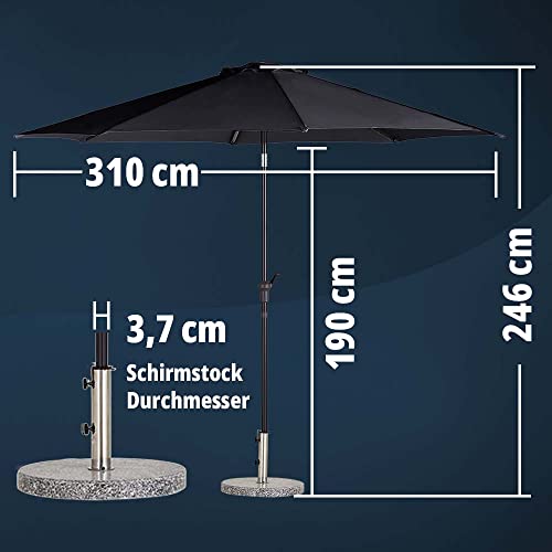 LIEFERUMFANG ⛱️ Sonnenschirm in der Farbe: Anthrazit, Durchmesser Schirm: 310 cm, Durchmesser Mast: 37 mm, Material Mast: Aluminium, Material Stoff: Polyester. Ein Schirmständer ist nicht im Lieferumfang enthalten.