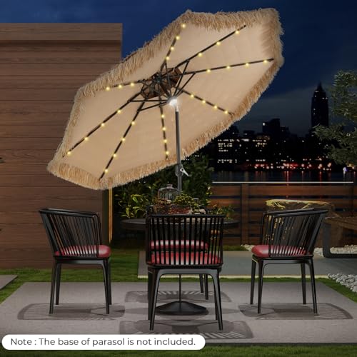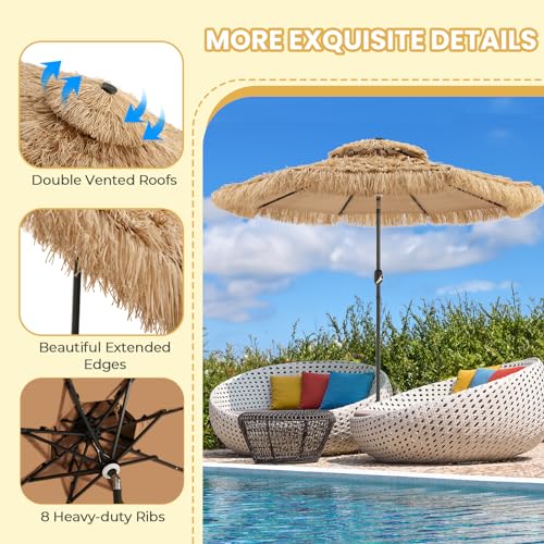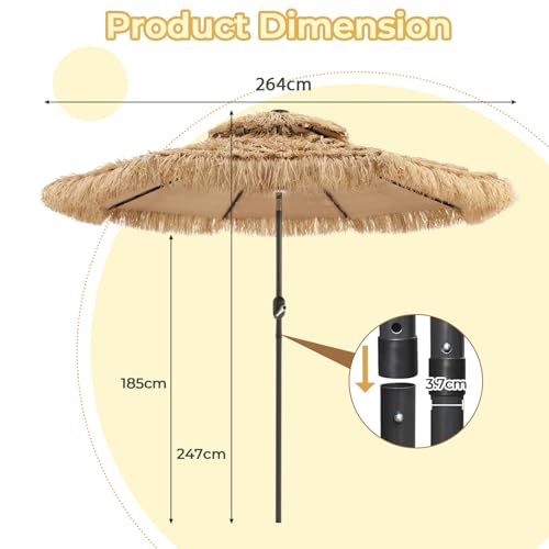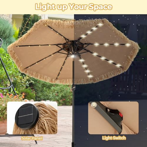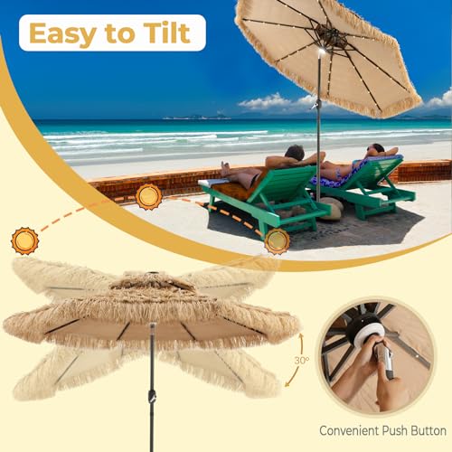 KOMFOTTEU Sonnenschirm Hawaii mit Lichtern, Strohschirm neigbar, Bastschirm mit Sonnenschutz & 8 Streben, Strandschirm mit Doppeldach, Marktschirm ohne Schirmständer