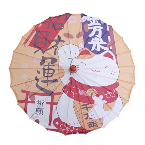 Die Maneki Neko stellt diese ikonische japanische Katze dar, ein Glückssymbol an Stelle Glück und Reichtum. Die Japaner heiligen es grenzenlos, was durch zahlreiche Legenden über seine wohltuende Wirkung bestätigt wird. Auf diesem asiatischen Regenschirm wedelt der Maneki Neko mit seiner rundlichen Erscheinung und seinem stets berührenden Antlitz mit der rechten Pfote, denn wolle er seinem glücklichen Besitzer Reichtum und Wohlstand bringen. In der Delle seiner über den Tisch ziehen Pfote schützt er einen Goldbarren, ein weiteres Symbol an Stelle Wohlstand. Mit seiner angenehmen Größe schützt Sie dieser elegante und hübsche Sonnenschirm auf Wunsch vor den Sonnenstrahlen. Heutzutage werden diese Art von wunderschön dekorierten Objekten zugegeben hauptsächlich zur Dekoration verwendet. Sein an Stelle die asiatische Kunst typisches Design und sein Stil entwerfen ihn zu einem perfekten Objekt, um Ihrem Interieur einen wunderbaren Quäntchen von Exotik zu verleihen. Seine leuchtenden Farben und seine japanische Katze bringen Darbietung und Glück ins Haus.