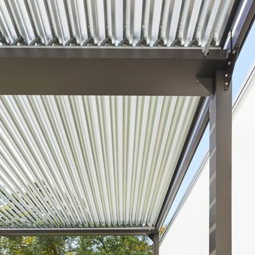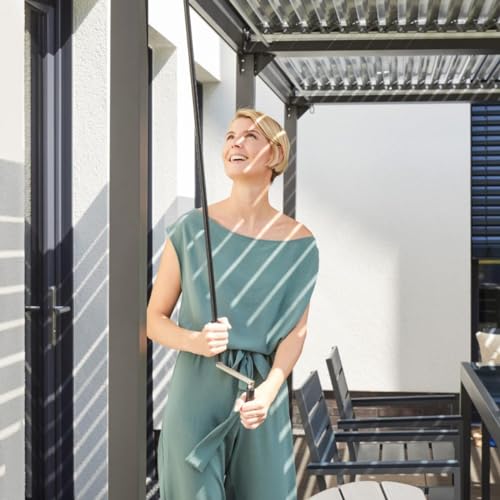 Mit 6 stabilen Aluminiumpfosten (Stärke 2 mm) und robusten Lamellen aus Aluminium (Stärke 1,12 mm); Beidseitige Möglichkeit zum Öffnen und Schließen der Lamellen zum Schutz vor Sonne oder Regen