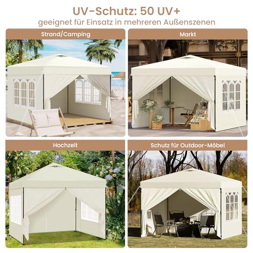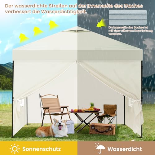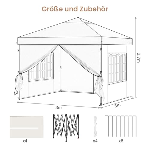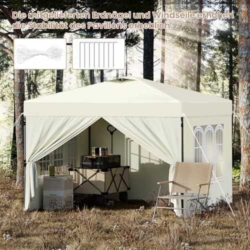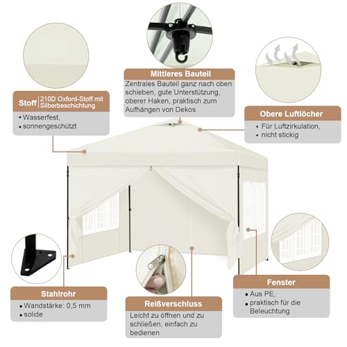 Laneetal Pavillon 3×3 m, Faltpavillon mit Seitenwänden, wasserfest stabil Winterfest, Outdoor Gartenpavillon, Partyzelt Gartenzelt, höhenverstellbar, UV Schutz, Metallrahmen, Beige