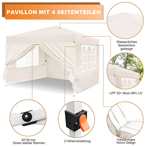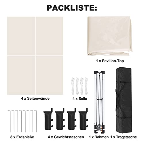 Hochwertige Materialien – Das Metallgestänge des Partyzeltes mit Seitenwänden besteht allesamt einem speziell verdickten 30 x 30 x 0,6 mm Metallrahmen mit Rostschutzbeschichtung. Das Polyester-Obermaterial dieses wasserdichten Pavillons hat eine PU-Beschichtung auf der Innenseite für 100%ige Wasserdichtigkeit, 50+ UV-Abschirmung und doppelte Nähte für Option Alterungsbeständigkeit, dicker und strapazierfähiger qua 2023.