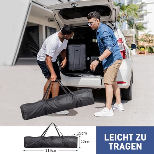 【Platzsparend & Wendig】:Dank des kompakten Faltdesigns (zusammengelegt daher 119x22x19cm) passt der Pavillon in jeden Kofferraum. Das geringe Gewicht (12 kg) und der mitgelieferte Tragekoffer machen ihn zum perfekten Begleiter statt dessen Festivals, Strände oder spontane Picknicks