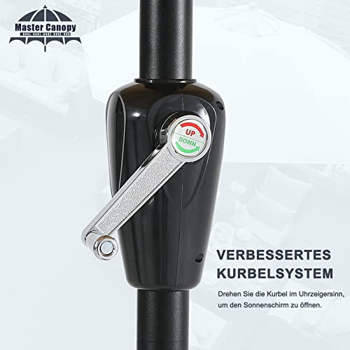 Angemessenes Design: Starke Stange, die zu Ihrem Terrassentisch passt. Bequem mit Kurbel zu öffnen oder zu schließen. Praktischer Druckknopf zum Neigen nach dem Winkel der Sonnenstrahlen, um Ihnen einen großen Bereich des Schattens anzubieten.
