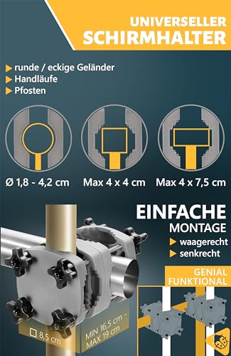 PLATZERSPARNIS UND SICHERER HALT – Der genial funktionale Schirmhalter passt universell an jedes Geländer (rund oder eckig, senkrecht oder waagrecht) und gibt dem Balkon-Schirm stabilen Halt.