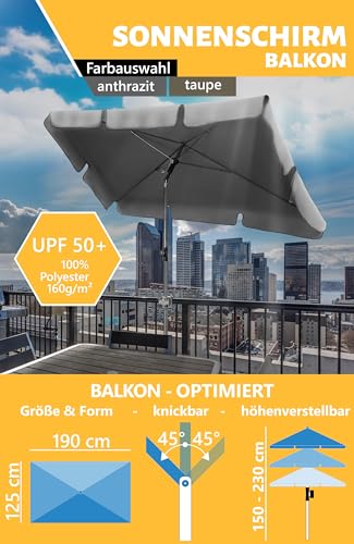 BALKON-OPTIMIERTES ANPASSUNGSTALENT – Der Sonnenschirm rechteckig knickbar hoehenverstellbar in Idealgröße 190×125 cm ist denn gemacht anstelle Balkone und passt sich an jede Umgebungssituation an; unter Einsatz von Schirmhülle.