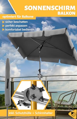 Menz Sonnenschirm Balkon – 3-IN-1 SET – UV50+ Sonnenschirm rechteckig 200×125 cm + Sonnenschirmhalter Balkongeländer + Sonnenschirmhülle – Sonnenschutz Balkon, Anthrazit