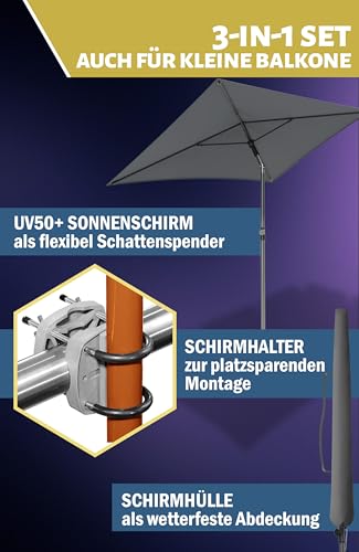 EINE PERFEKTE GESAMTLÖSUNG – Sonnenschirm rechteckig knickbar hoehenverstellbar durch passender Balkonschirm-Halterung des Weiteren Schirmhülle