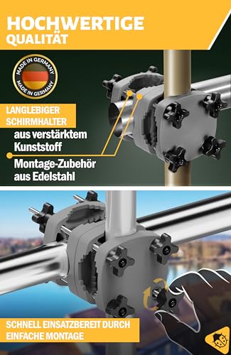 UNIVERSELLE ANPASSUNG: Unsere Top 1 Sonnenschirm Halterung Balkon bietet höchste Stabilität und lässt sich mühelos vertikal oder horizontal an runden und eckigen Geländern, Handläufen, Pfosten montieren