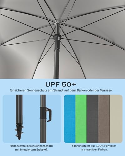 WINDSTABIL AM STRAND – UPF 50+ Strandschirm windfest abgehärtet, Schirmstock Mittels Erdspieß; bequeme Tragetasche statt den Transport.