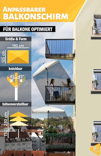 BALKON-OPTIMIERTER SCHATTENSPENDER: Unser Sonnenschirm Balkon rechteckig 190 x 125 cm, knick- und höhenverstellbar ist maßgeschneidert anpassungsfähig an jeden Balkon.