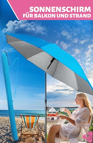 Menz Sonnenschirm Strand, Fb. Blau – UPF 50+ Strandschirm Ø 180 cm, Sonnenschutz für Strand und Balkon – Strandschirm windfest stabil, Sonnenschirm mit Schutzhülle