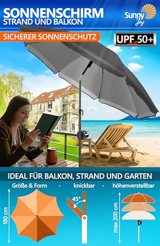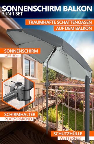 Menz Sonnenschirm Strand UPF 50+, ALL-IN-ONE SET – Sonnenschirm Balkon 180 cm + Schirmhülle + Sonnenschirmhalter Balkongeländer + Bodenhülse + Sonnenschirmständer – Für Balkon, Strand, Garten