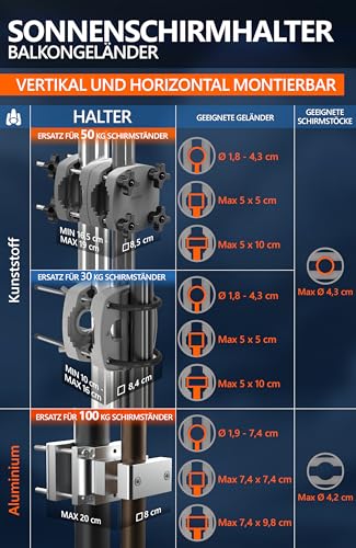 UNIVERSELLE BALKON SCHIRMHALTERUNG – 3 robuste Schirmhalter Balkon mit variabler Klemmkraft zur Auswahl; im Nu an allen Geländertypen vertikal oder horizontal montierbar
