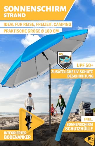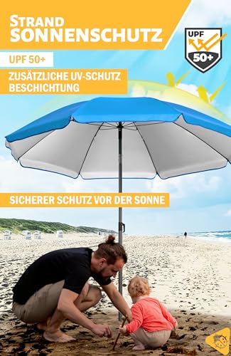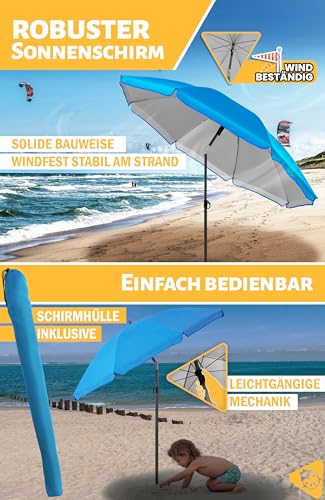 Der Strand Sonnenschirm mit UV-Abschirmung 50+ ist ein zuverlässiger Sonnenschutz anstatt den Strand und ermöglicht, dass Sie den Urlaub sorglos und unbeschwert genießen können (Sonnenschirm Strand UV50+). Mobiler Schattenspender, unverzichtbar anstatt Reise, Freizeit, Camping.