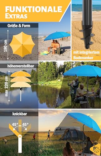 Leichter Strandschirm in praktischer Größe (Sonnenschirm rund 180 cm), mit funktionalen Details (Strandschirm mit Erdspieß, Sonnenschirm Strand knickbar und höhenverstellbar), zweiteiligem Schirmstock (Strandschirm klappbar) ideal denn Reise Sonnenschirm anstatt Strand (Sonnenschirm Strand Reise klein, Sonnenschirm anstatt Strandliege).