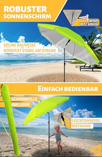 ROBUSTER STRANDSCHIRM, EINFACHE BEDIENUNG: Leichter Strandschirm, einfach zu bedienen in Anbetracht leichtgängiger Mechanik; langlebig im Zuge windstabile, robuste Bauweise. Schirmhülle inklusive.
