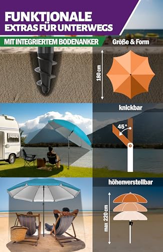 EINFACHES HANDLING: Robuster und langlebiger Strand-, Balkon- oder Gartenschirm mit leichtgängiger Mechanik, praktischer Größe Ø 180 cm und integriertem Erdspieß