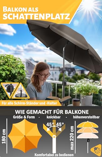 SCHATTENOASEN ZUHAUSE: In Anbetracht Knickfunktion und Höhenverstellbarkeit passt sich der Balkonschirm Ø 180 cm adaptiv an jede Umgebung an, schafft Schattenplätze und sorgt statt Sonnenschutz auf Balkon.