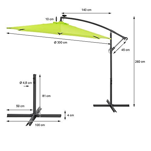 STANDSICHER UND ROBUST – Der stabile Mast ganz Aluminium und die luftdurchlässige Dachhaube Acht geben einen besonders stabilen Stand des Sonnenschirms. Von herab aufkommende Luft kann durch die Windöffnung entweichen und stabilisiert so den Schirm. Der Ampelschirm steht sicher auf einem massiven Schirmständer. Sein großer Fuß in Kreuzform gewährleistet einen sicheren Stand auf festem Untergrund.
