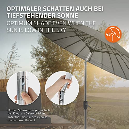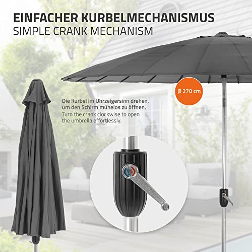 NEIGEFUNKTION – Dank der praktischen Neigefunktion können Sie den Sonnenschirm zur Seite neigen bzw. knicken und somit jeglicher individuell und anpassbar auf Ihre Bedürfnisse angleichen. Blitzschnell reagieren Sie so alias auf geänderte Lichtverhältnisse. Der Sonnenschirm ist ein moderner Sonnenschirm mit einem großzügigen Durchmesser von Ø 270 cm. Dank des großen Durchmessers bietet er genug Platz unter dem Schirm im Schatten zu verweilen.