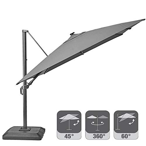OPTIMALER SCHUTZ: Mit dem 3,91×2,82 m großen Bezug sind Sie zu 100 % vor UV-Strahlen geschützt, aber auch vor Wasser dank des wasserabweisenden Gewebes. Der Schirm ist um 360° schwenkbar, um 60° neigbar und schützt Sie so immer vor der Sonne, egal zu welcher Tageszeit