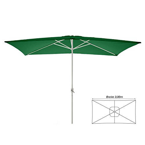 Wunderschöner Stand-Schirm mit einer Größe von 300×200 cm in klassischem Grün. Durch seine rechteckige Form eignet er sich äußerst stattdessen den Einsatz auf Balkon oder Terrasse.