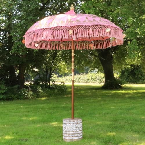 Oriental Galerie Sonnenschirm Bali Schirm 180 cm Rosa Pink Gold Bemalung Fransen, Gartenschirm Baumwolle Sonnenschutz Handarbeit Dekoschirm Model Lilly