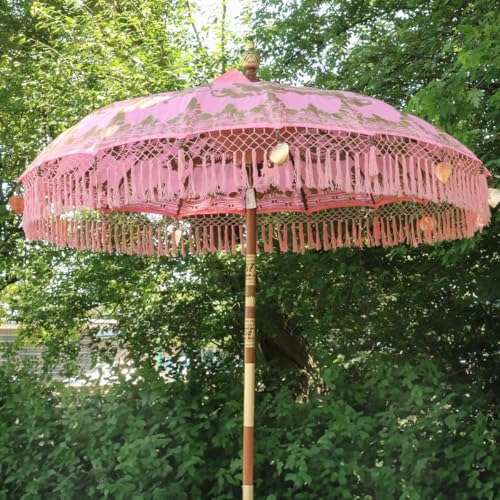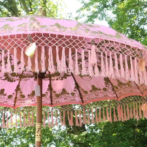 Balinesischer Sonnenschirm mit Fransen – Rosa mit goldfarbenen Verzierungen