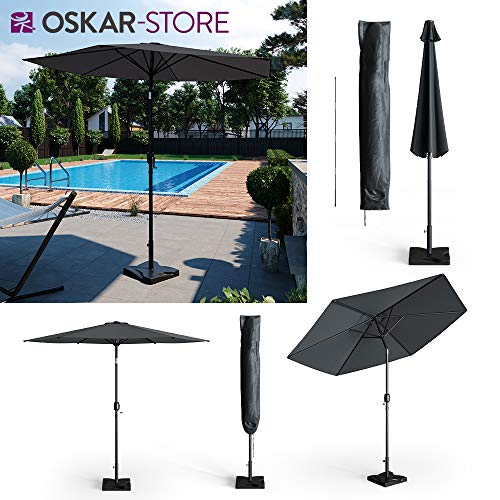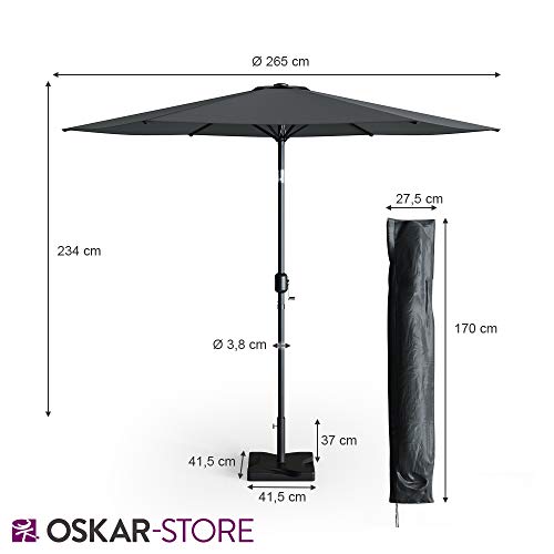 Die Gesamtmaße betragen beim Sonnenschirm 270 x 234 cm (BxH), angrenzend der Schutzhülle 27,5 x 170 cm (BxH) ansonsten angrenzend dem Ständer 41,5 x 37 x 41,5 cm (BxHxT).