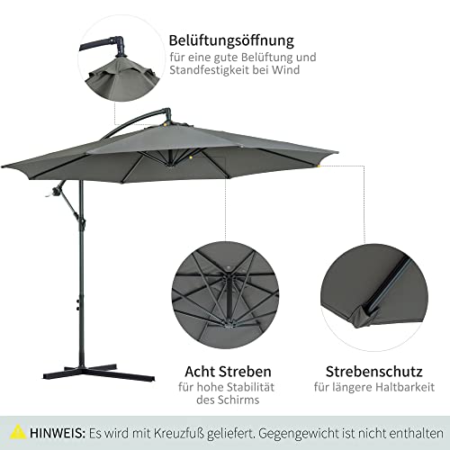 Unser hochwertiger und großer Ampelschirm ist der perfekte Schattenspender für sonnige Tage. Vielseitig lässt er sich auf Ihrer Terrasse, Ihrem Balkon oder bei einer Feier anpassen. Die Schirmstange besteht ganz robustem Stahl. Der Sonnenschirm an sich ist ganz wasserabweisendem Polyester gefertigt. Der Neigungswinkel des Schirmbezugs lässt sich anpassbar eichen, damit Sie den besten Abschirmung vor starker Sonneneinstrahlung genießen. Dank der Handkurbel lässt sich Ihr Gartenschirm einfach öffnen und abstrahieren. Da kann der Sommer kommen!
