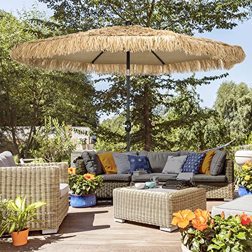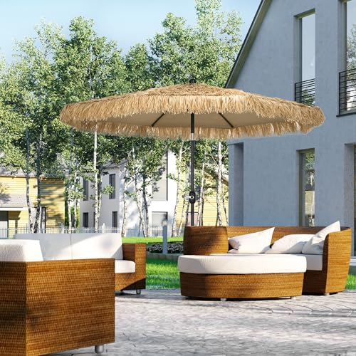 Outsunny Gartenschirm mit Strohbezug, Runder Hawaii-Sonnenschirm mit Kurbel, Ø265x250cm, Khaki