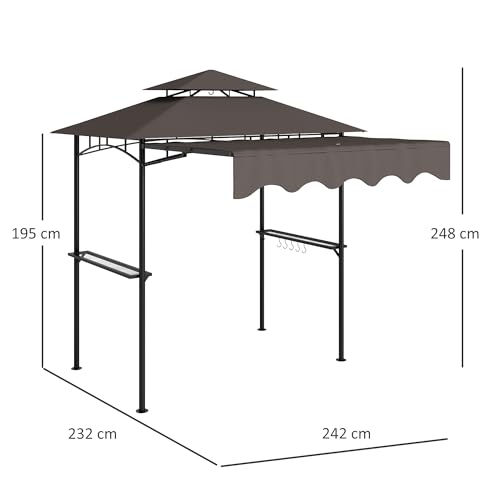 Gesamtabmessungen der Pergola: 242L x 149B x 248H cm. Belastbarkeit: 20 kg (Regal), 2 kg (Haken). Montage erforderlich. Hinweis: Statt dessen Grills bis zu einer Breite von 180 cm im Rahmen, bitte Maße vor dem Aufkauf nachprüfen.