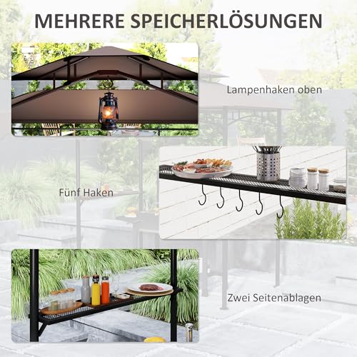 Geräumige Aufbewahrung: Dieser Grillpavillon ist mit zwei Seitenregalen und fünf praktischen Hängehaken sowie einem zusätzlichen oberen Haken Statt dessen eine Lampe ausgestattet, sodass jeder Grillutensilien stets zur Hand sind.