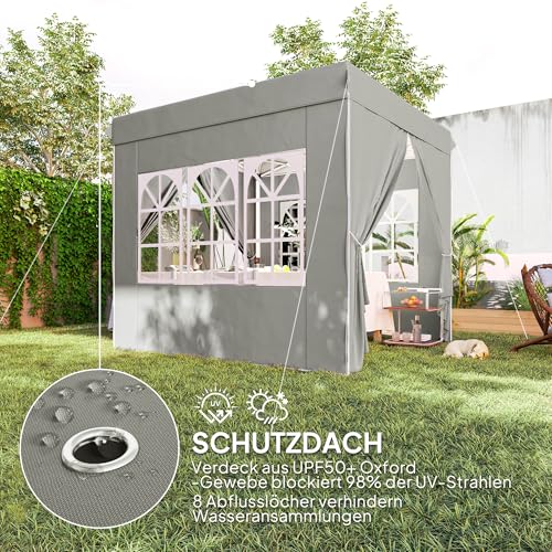 UV-Abschirmung: Durch einem UPF50+ Oxfordstoff ausgestattet, schützt das Zelt effektiv vor 98% der UV-Strahlung u. a. hat acht Ablauflauflöcher gegen Wasserstau. Der Faltpavillon sollte nicht neben schlechtem Wetter aufgestellt bleiben