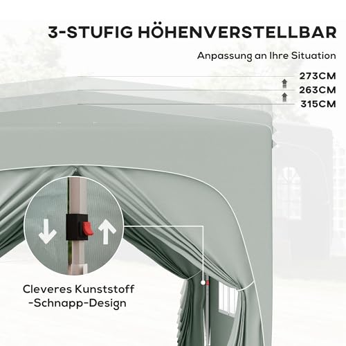 Höhenverstellbar: Die dreistufig verstellbaren Metallbeine dieses Gartenzelts ermöglichen eine leichte Abwandlung der Höhe (273/263/253 cm), ideal für verschiedene Outdoor-Events und persönliche Vorlieben.