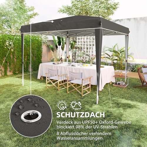UV-Schutz: Die Dachplane aus UPF50+ Oxford-Gewebe des klappbaren Pavillons blockiert 98% der UV-Strahlen. Acht Ablauflöcher vermeiden Wasserstau und sorgen so für zuverlässigen Schutz. Nicht bei starkem Wetter aufgebaut lassen